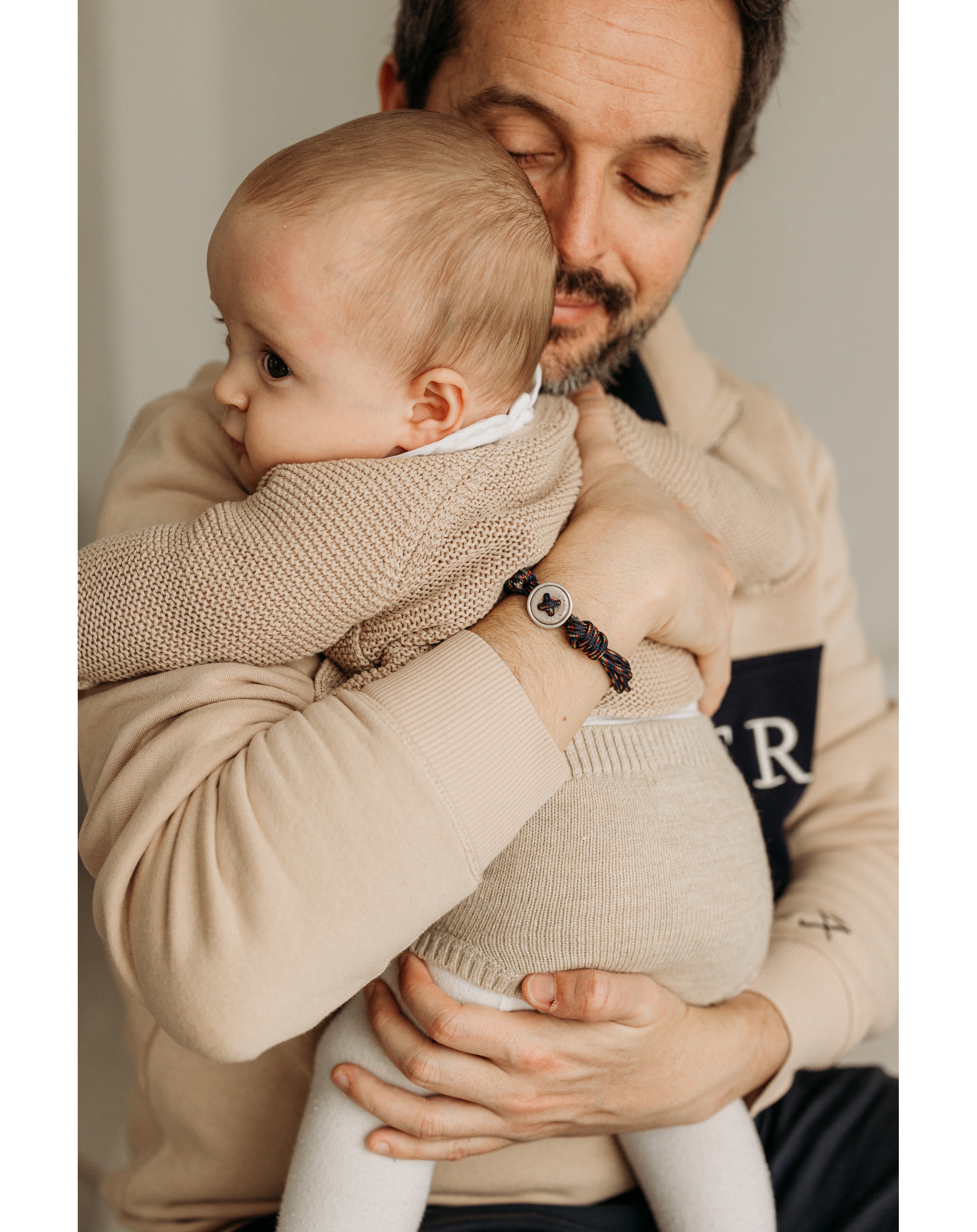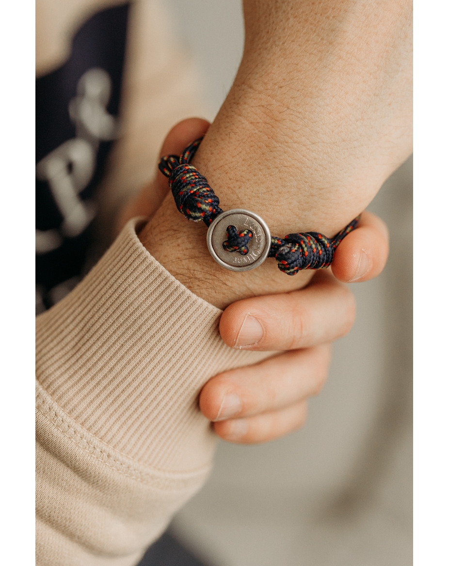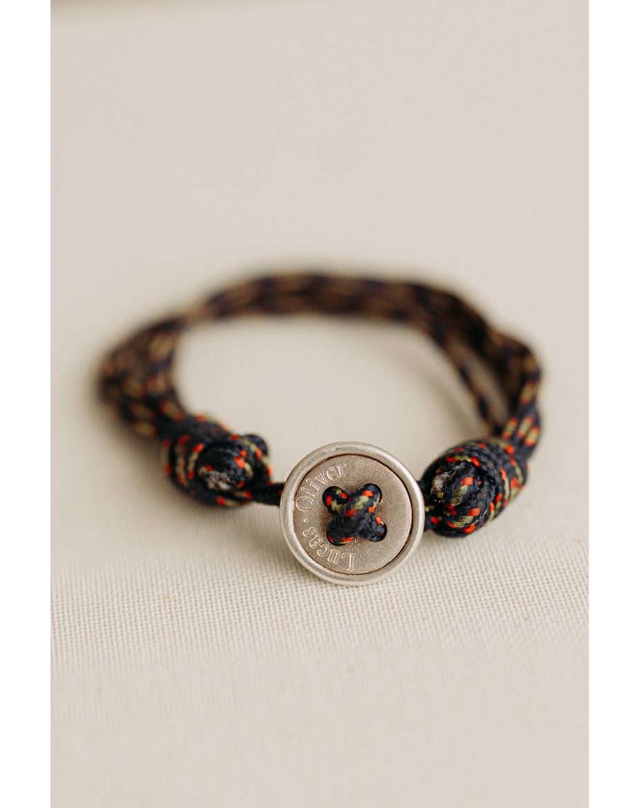 Silver button set in a wristband. Sand textured finish. The chain is adjustable to any type of wrist thank to the moving knot.
