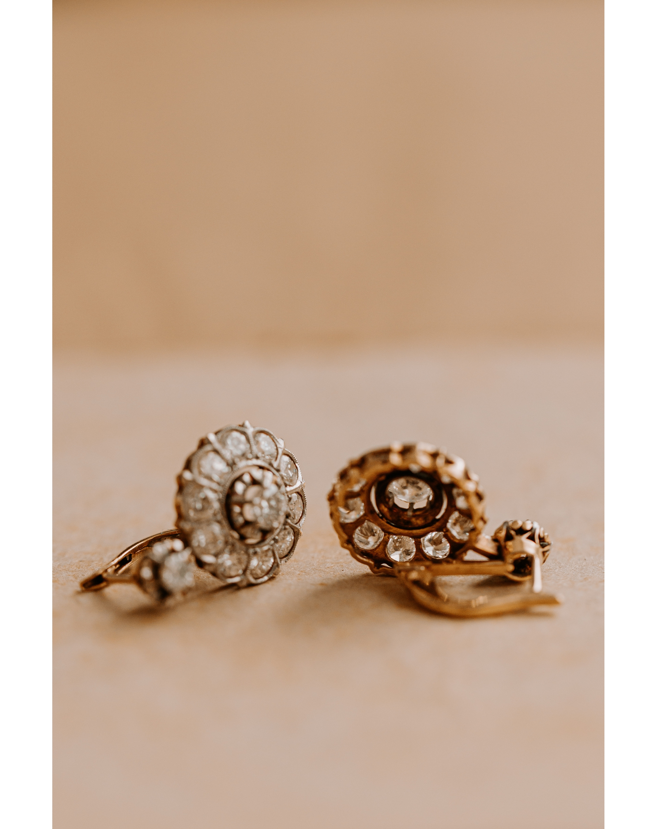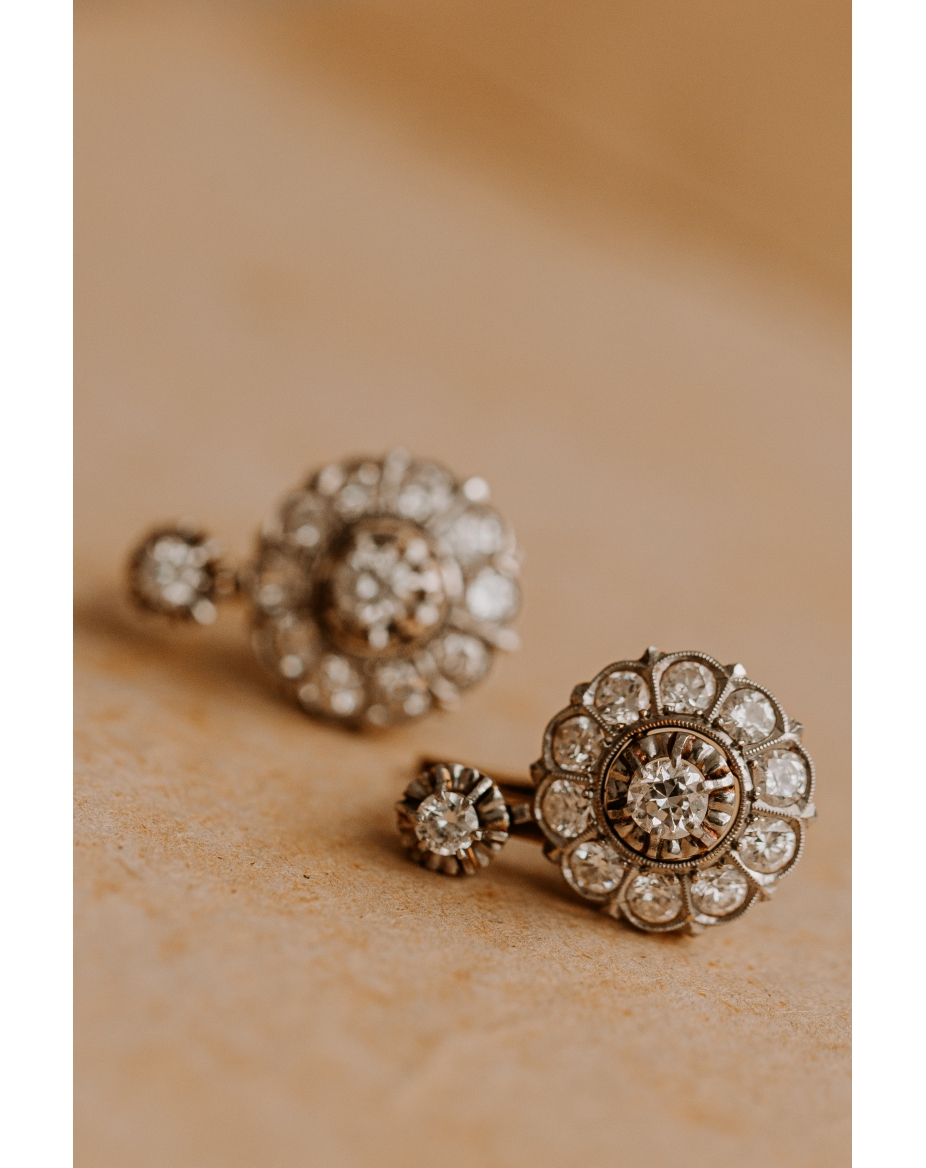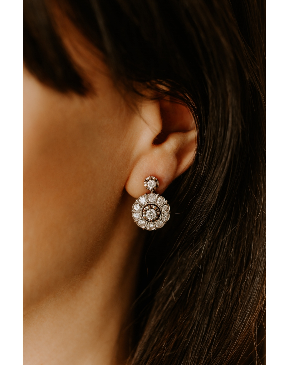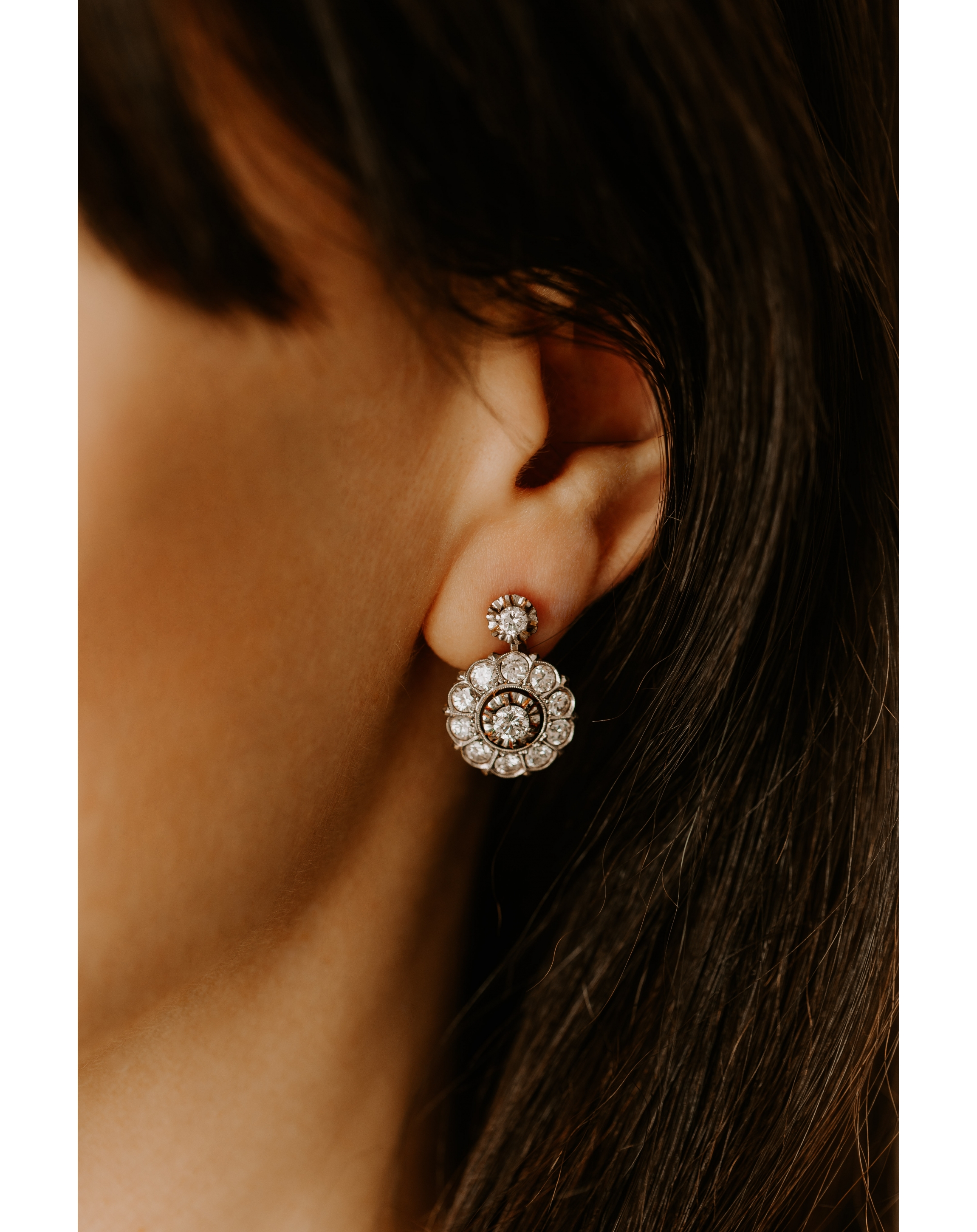 Pendientes antiguos realizados en platino y en oro de 14kts. Aportan muchísima luz al rostro, fruto de los 24 diamantes que adornan la flor y que suman un total de 2,5cts. Llevan cierre de ballestilla.